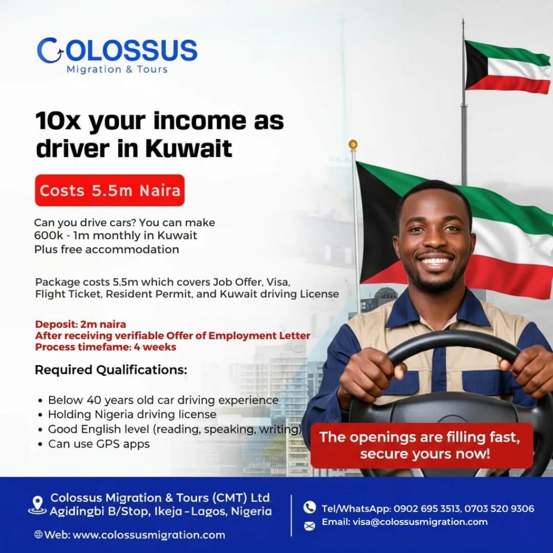 Package costs 5.5m which covers Job Offer, Visa, Flight Ticket, Resident Permit, and Kuwait driving License