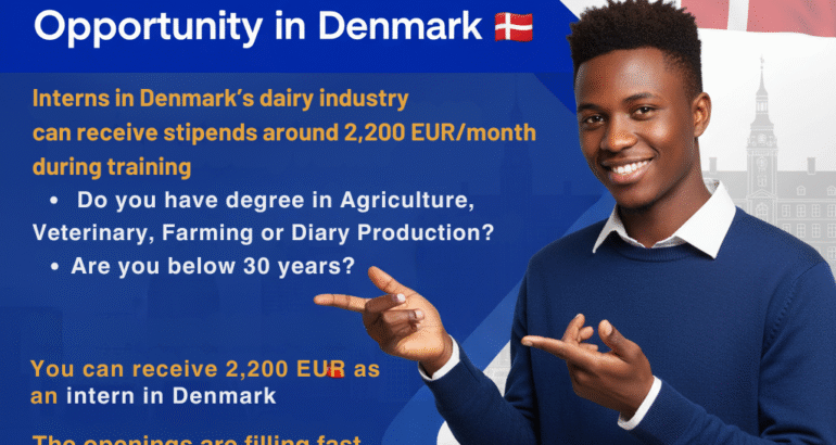 Dreaming of working abroad and gaining hands-on international experience in agriculture or dairy production? Here’s your chance to turn that dream into reality — with a paid internship in Denmark! Denmark is one of Europe’s leading countries in modern and sustainable dairy farming. Through this exclusive internship program, you’ll gain valuable, real-world experience on Danish dairy farms — learning advanced farming techniques, livestock management, and production processes used by some of the best farmers in the world. Whether you studied Agriculture, Veterinary Medicine, Animal Science, Farming, or Dairy Production, this program is designed to help you build your career while earning a solid income abroad. 💶 Receive up to 2,200 EUR (3.5 million) per month as a paid intern.🌿 Gain international experience that boosts your career prospects.🏡 Enjoy Denmark’s high living standards and beautiful countryside.🌍 Build global connections and expand your professional network. No hidden fees. No fake promises. Just a genuine pathway to success in one of Europe’s most respected agricultural industries. Eligibility Requirements: ✅ Must hold a degree or qualification in Agriculture, Veterinary Medicine, Animal Science, or Dairy Production.✅ Must be under 30 years old.✅ Must be passionate about working and learning in a professional farming environment. 👉 Applications are open now — but spots are limited! Don’t miss your chance to secure a life-changing international internship opportunity in Denmark.